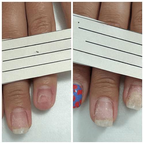 - сохранение естественного размера и формы ногтя. Наблюдаются изменения цвета – появляются белые линии, пятна. Иногда ощущается неприятный запах