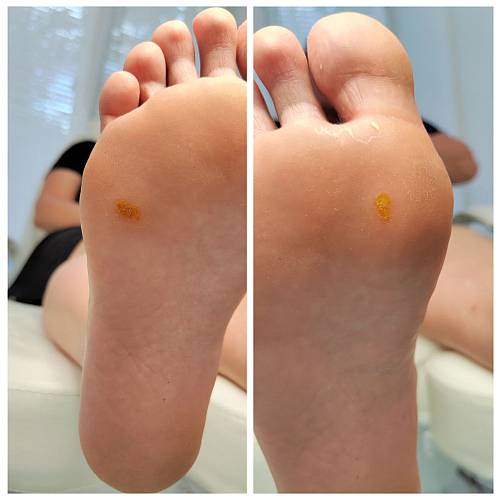 - Подошвенные. Дефект округлый, вызывает болезненность. Подошвенная бородавка поражает кожу кистей, коленей, стоп.
